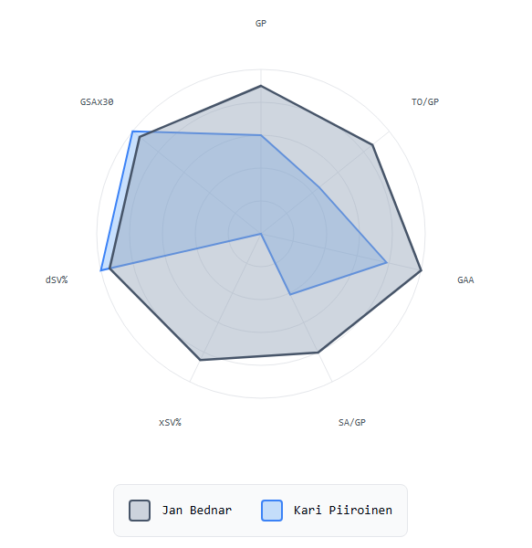 xSV% (eli torjuntaprosenttiodottama) on Kari Piiroisella kaikista huonoin koko Liigassa. Mediaanimaalivahdin torjuntaprosenttiodottama on 89,15%, kun Piiroisella se on 86,13 %. Piiroisen aito torjuntaprosentti 90,40 % on siis todella kova saavutus verrattuna torjuttuihin tilanteisiin. Bednarilla torjuntaprosenttiodottama on 89,55 %, joka on hieman jopa mediaania parempi. Bednarilla on siis ollut helpompaa maalillansa.