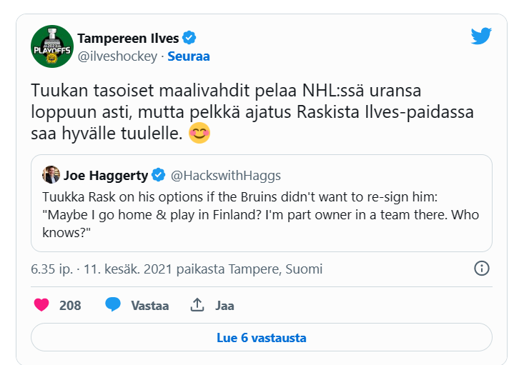 Siis Rask heitti 2021 kesällä sen juttunsa, että jos ei jatkoa tule Bostonista, niin ehkä palaan kotiin.