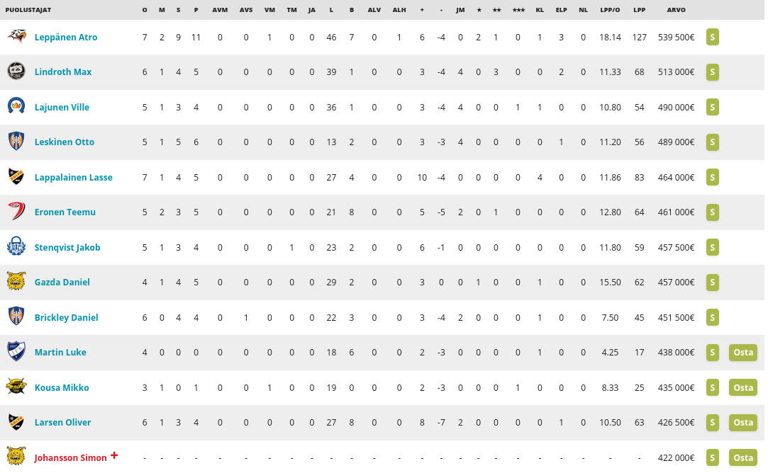 Joo Leskinen tuli itsellenikin mieleen että jos pakko olisi niin siihen sitten. Ohessa Liigapörssin puolustajien pörssikärki joka antaa ihan ok kuvan Liigan huippupakeista: