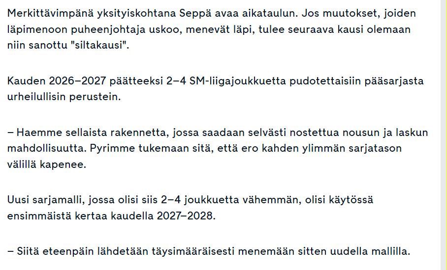 En lähde arvailemaan, mikä toteutuu ja mikä ei, mutta itse näen tuon Sepän suunnitelman hyvin johdonmukaisena. Kuvitellaan nyt, että päädyttäisiin siihen, että A-sarjaa pelataan vain kahdellatoista joukkueella.