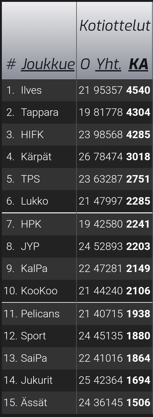 Paitsi totuttu Ilves kärjessä oli kyse sitten sarjataulukosta tai yleisökeskiarvosta.