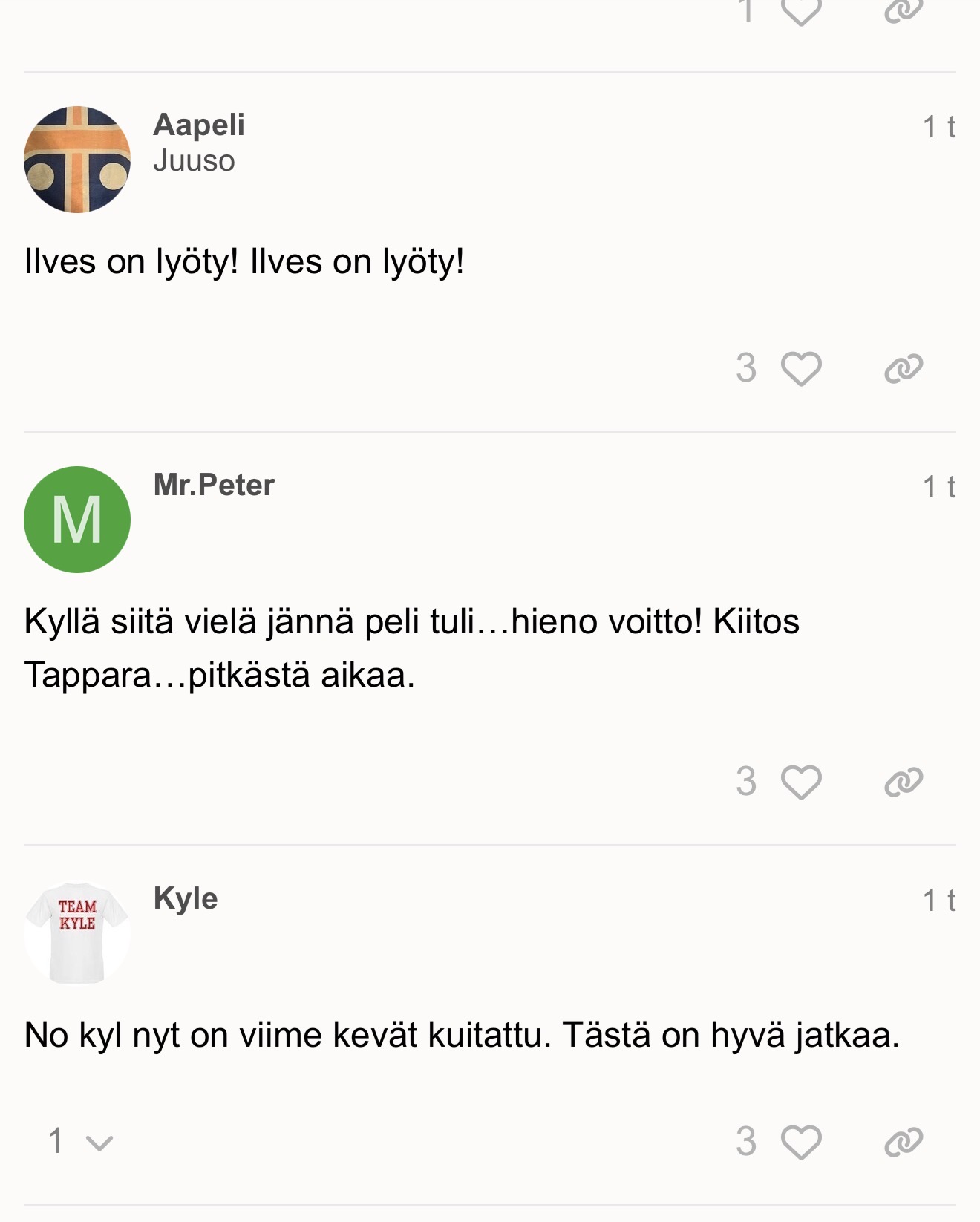 Ehkä näistä Tampere Cupin peleistä kannata vetää kummankaan joukkueen pelaajista mitään johtopäätöksiä. Nyt on menossa treenikausi ja alla vasta hetki harjoituksia, pelisysteemi hakee muotoaan, ketjut eivät ole vielä valmiit, yv- ja av pahasti keskeneräisiä, yhteispeliä ei ole vielä päästy paljoa kokeilemaan ja sitä rataa. Itse otan nämä ihan puhtaana höntsyviihteenä (oluen kanssa) eikä voitto ja tappio vaikuta yhtään mihinkään.Blichfeld poislukien niin aika valju kuva jäi Tapparan hankinnoista. YV oli hyvää ja sai toki Ipan junnuketjuja vastaan painetta ja jäähyjä. Toki osa tuli kyllä aika heppoisesti. Etenkin tämä Sylvegård oli sysipaska. Jokipakka jatkoi samaa velttoilua kuin Ilveksessä - toki yritti antaa kovuutta kun ei vauhti riittänyt. Eetu Tuulola - pelasiko? Viime kauden pelaajista ihmettelin Keskistä. Todella heikkoa tekemistä - jatkoi siitä mihin keväällä jäi.