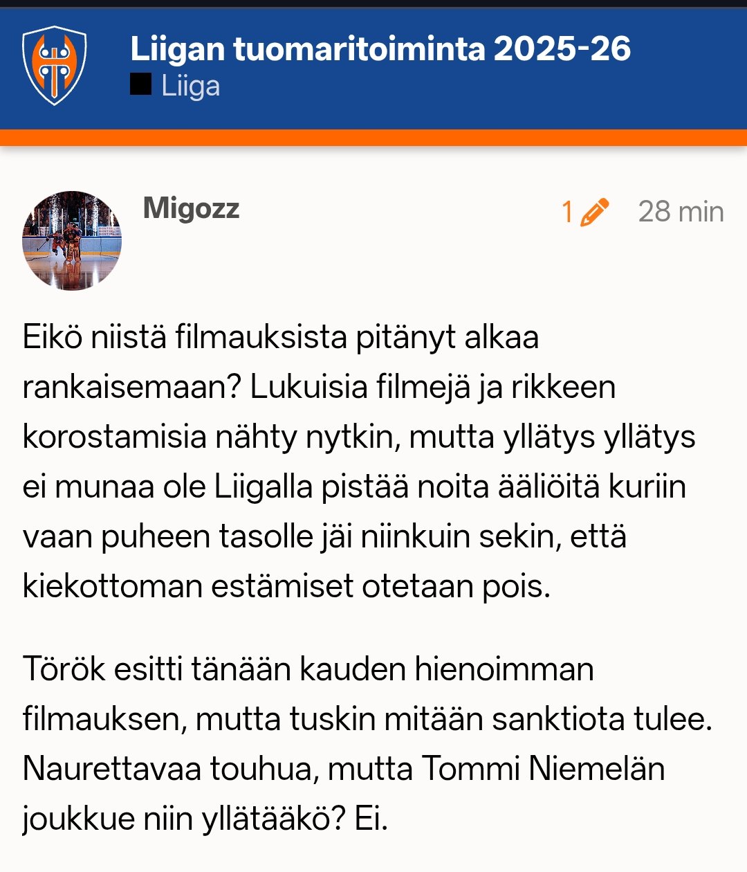 Kyllähän jääkiekossa filmataan ja Ilves-pelaajat filmaavat siinä missä muut, mutta sitä oon aina vähän ihmetellyt, kuinka joka kerta, kun jotain tärähtää päähän ja iskun saanut pitelee hetken päätään/kasvojaan ja nousee sitten ylös "niin kuin ei mitään" siitä puhutaan kuin todisteena filmauksesta. Maailman luonnollisin spontaani reaktio ihmiselle, jolle tulee yllättävä kova isku mihin tahansa pään seudulle on painaa kädet pään ympärille/kasvoille - ja aika usein siitä ollaan hetken päästä niin kuin ei mitään olisi tapahtunutkaan. Toki Török nyt tässä makasi jonkin aikaa jäässä, enkä lähde arvailemaan, olisiko voinut nousta nopeamminkin.