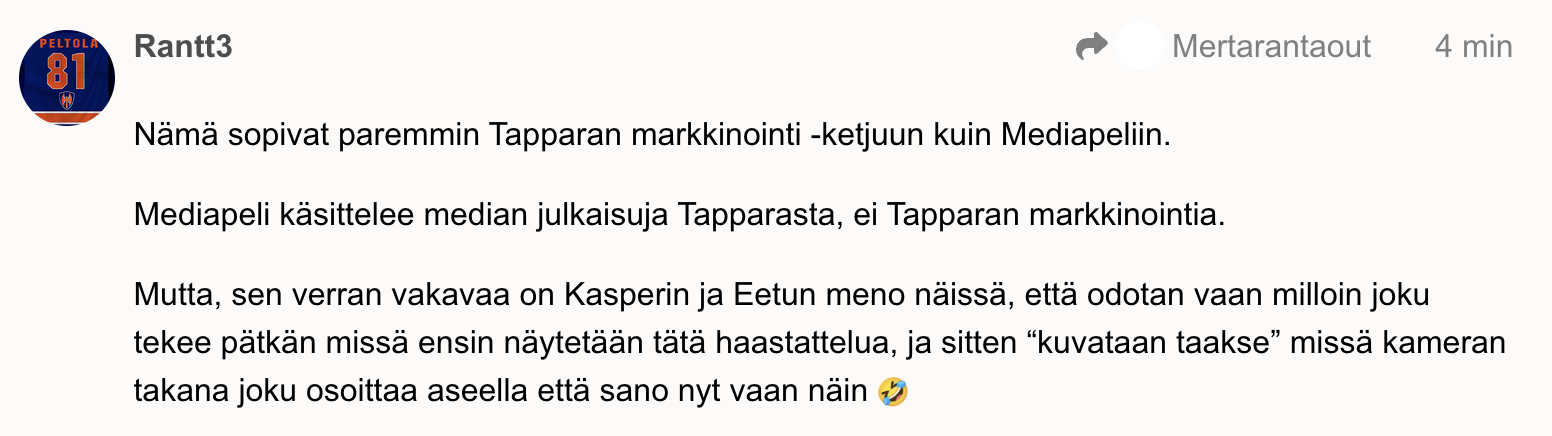 Ylipäätään jotenkin Tapparan viestinnästä ja retoriikasta on huokunut sellainen että kunhan mestaruudet voitetaan niin kaikki muu voidaan tehdä päin helvettiä. Sitä en tiedä tarkalleen tietysti mitä esimerkiksi nuo Hautamäen vittuilut ovat sisältäneet Areenan aikana mutta ihan jo tuosta ulospäin viestinnästä huokunut sen korostaminen että menestys on itse seuraa tärkeämpää. Tämä varmasti iskee nyt vähän vastapalloon kun jengi ajattelee että maha on täynnä mestaruuksista, vaikka sen pitäisi olla ihan sivuseikka kun sitä itse seuraa ja joukkuetta mennään katsomaan. Sen myötä myöskään kannattajat eivät osaa arvottaa välieräpeliä lipun hinnan arvoiseksi. Eli mielestäni Tappara on itse luonut tällaisen narratiivin ja ilmapiirin.