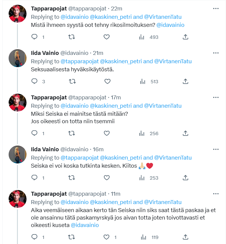 En aio ottaa itse tähän caseen mitään kantaa, antaa ammattilaisten tutkia. Sen verran nyt kuitenkin sanon, että eihän noi ole helppoja asioita ja ei 17-vuotiaan välttämättä ole helpointa ottaa asiaa esille. Ethän sinä nyt lisäksi voi tietää onko 2 vuotta mennyt oikeasti ilman huolen häivää. Ymmärrän, että omia puolustetaan mutta sen voi tehdä myös syyttämättä toista osapuolta suoraan valehtelijaksi, jos ja kun sulla ei faktaa ole. En mä lähde tässä Heljankoa tuomitsemaan ilman faktaa, mutta en myöskään hyökkäämään Vainiota vastaan ilman faktaa.