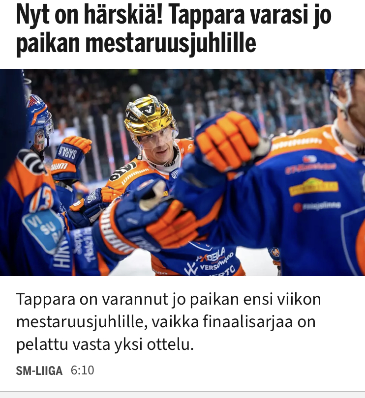 Tällä kaudella Tappara voittaa ihan kaiken ja jokseenkin näytöstyyliin, ensi kaudelle uusiutuu lähes kaikki. Jos ne ei ens kaudella ole voittamatta, niin koska sitten?