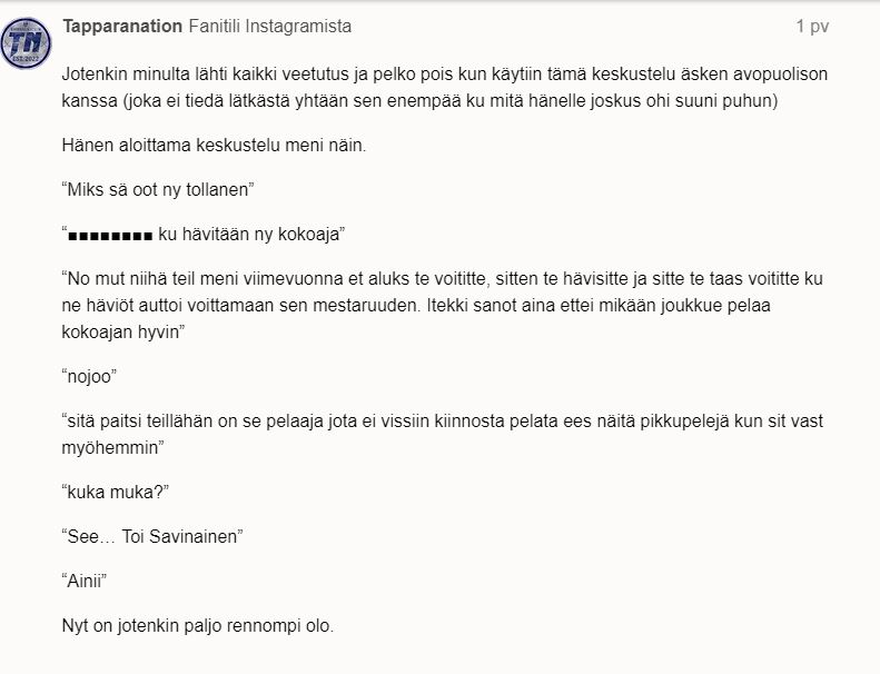 Näin oli, mutta tuostakaan tapauksesta ei tiedetä sen tarkempaa. Moni olettaa, että tässäkin kyseessä on se tyypillinen "Tappara-fani". Tapparan päädyssä on sinioranssien lisäksi muitakin faneja sekä ihan tavallisia rivikatsojia, jotka muuttuvat tällaisiksi sankareiksi viikonloppupeleissä viinaa saatuaan. Myös keskenkasvuisilla kakaroilla voi olla taipumus idiotismiin. Koska fanikatsomon paikat ovat numeroimattomia, keskusteluyhteyden muodostamiseen olettaisin vaativan henkilökohtaisilla tunnuksilla ostetun istumapaikkalipun. Pelkästään sen perusteella, että jostain päädystä kuuluu huutoja, ei kannata leimata isoja ryhmittymiä.