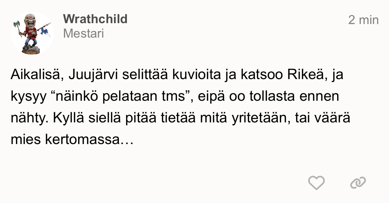 Sehän ei käy pukukopissa. Jos se nyt menee ja löytää.Röönpori oli hyvin tyytymätön joukkueeseen. Intohimo uupuu joukkueelta. Heitti bussin alle tän päivän rosteriin nostetut pelaajat. Yrittää etsiä pelaajia ketä kiinnostaa pelata kauden lopussa, mistähän muuten löytää kun siirtoraja meni jo