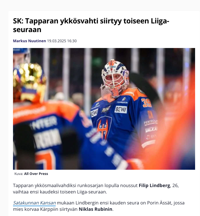 Kuulostaa ihan Kärppien toiminnalta tuon tason tuhlaaminen.Hölmöähän tuo olisi. Maalivahdeissa olisi kiinni sellainen 600 000 euroa. Siinä tulee muuten pelille hintaa Metsolan kohdalla.