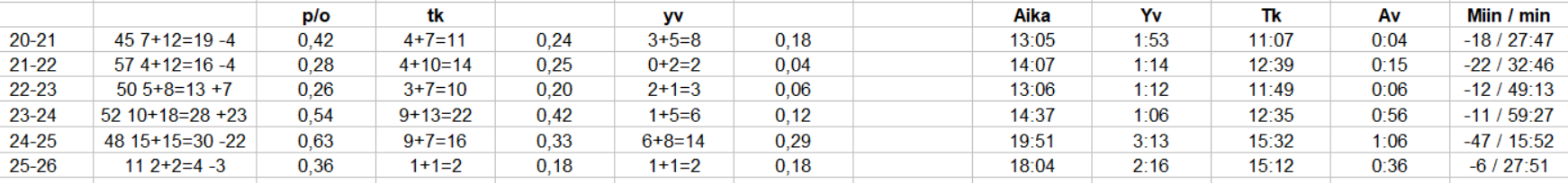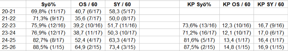 OS=onnistuneet syötöt peliaikaan suhteutettuna SY=syöttöyritykset. KP=korkean paineen syötöt. Noissa korkean paineen syöttöyrityksissä ajattelen hyökkääjillä korkeamman määrän peliaikaan suhteutettuna olevan parempi juttu, joten siksi ne olen tuohon järjestykseen laittanut.