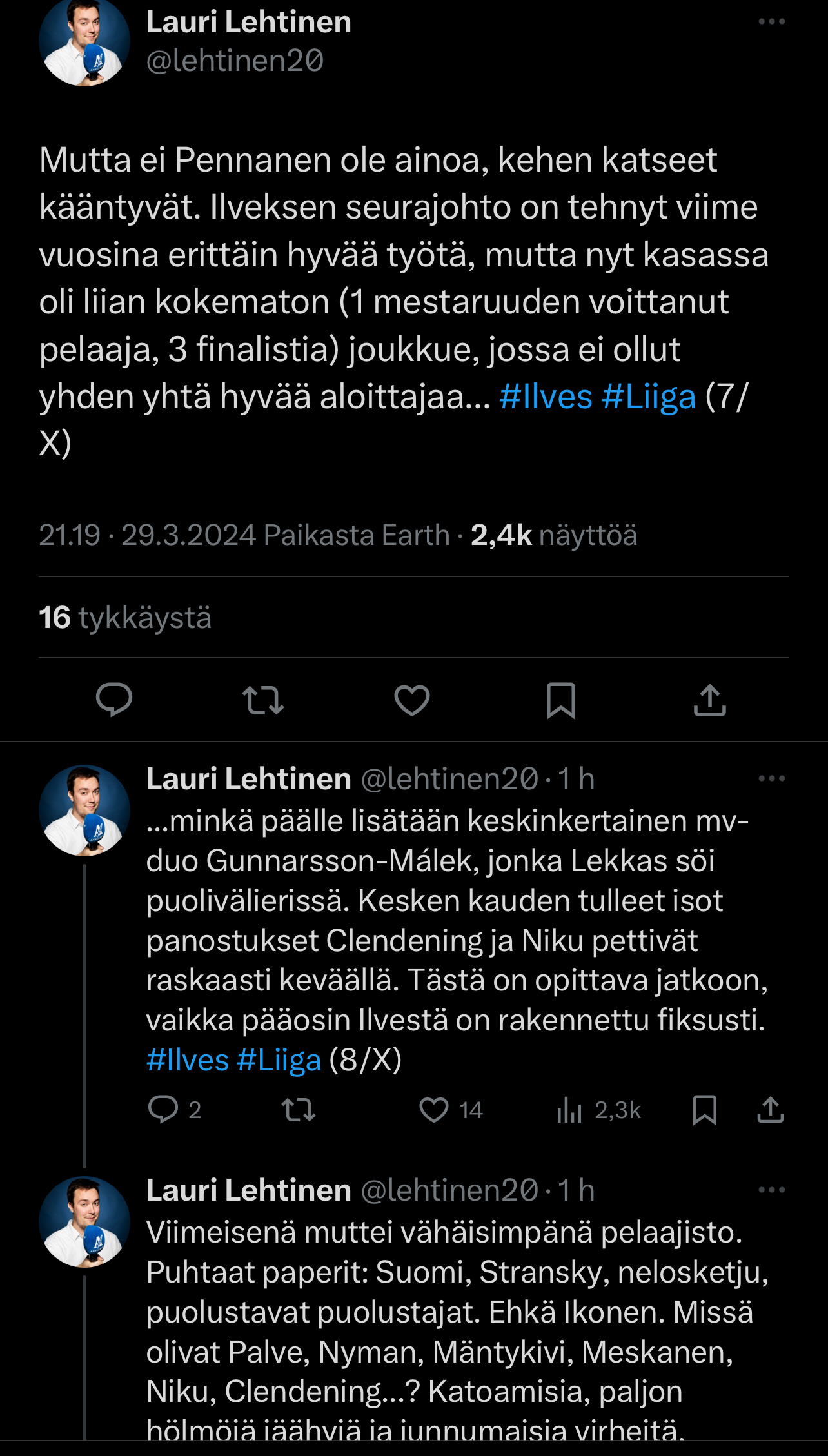 Timolta kyllä karmea virhe laittaa Palveen emäntä tiineeksi tasan 9kk ennen kevään ratkaisupelejä.No ei tämä oikeasti pidä paikkaansa. Joukkueen ykkössentterin ajatukset olivat kaikkialla muualla kuin Ilveksessä ja Clendening oli ihan täydellinen floppi. Jos kaksi joukkueen kulmapilaria pettää näin totaalisesti on ihan turha puhua mistään mestaruuksista. Ja listaa voi jatkaa vaikka kuinka pitkään...