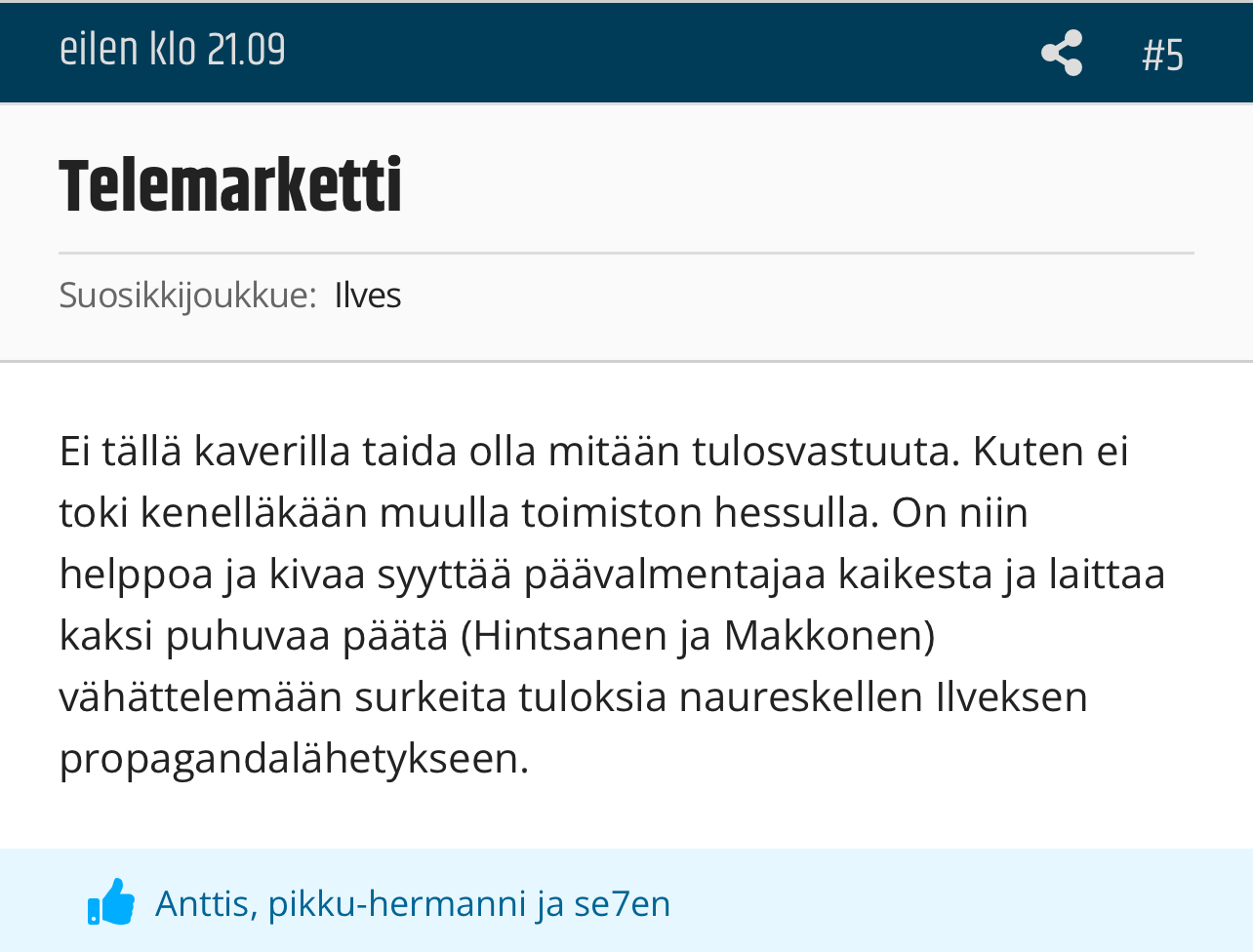 En kai mä suoranaisesti niin sanonut. Mutta onhan vähän samansuuntaista muualtakin kuulunut kuten kirjoitin.