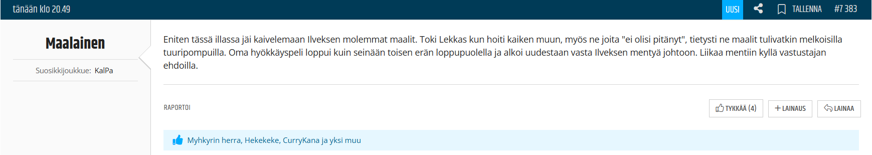 Muuten pelistä jäi mieleen Ilveksen puolustaneen hyvin ja Kalpa ei päässyt huippupaikoille. Hyökkäämispelaaminen taasen oli aika heikkoa tasakentällisin.