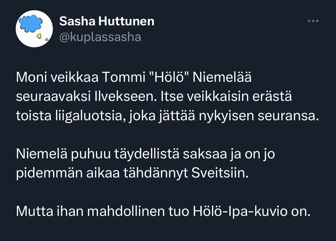 "Voi myös kasvaa". Ainahan se menee näin. Näytä valmentaja, joka on voittanut Liigamestaruuden ensimmäisellä kaudellaan valmentajana.Toki mestariksi voi myös kasvaa mutta harva valmentaja ikinä voittaa mestaruuksia, joten sinänsä siinä on riskinsä. Millä perusteella mestaruuteen on paremmat saumat Niemelän kuin Kiven kanssa? Kuulostaa ihan hatusta heitetyltä mutu-tuntuman väitteeltä.