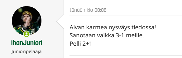 Soini ja Heinonen tilalle vai? Laitetaan ne pelaa 20 minsaa Frimanin ja Lancan tapaan niin voisi ollaa lopputulos jotain ihan muuta kuin voitto. "Jopa voittaa", on tässä kolme liigan kärkibudjettia voitettu putkeen vaikka koko kolmikkosi on ollut kentällä.Friman Stranský ja Les vilttiin niin voidaan peli jopa voittaa.