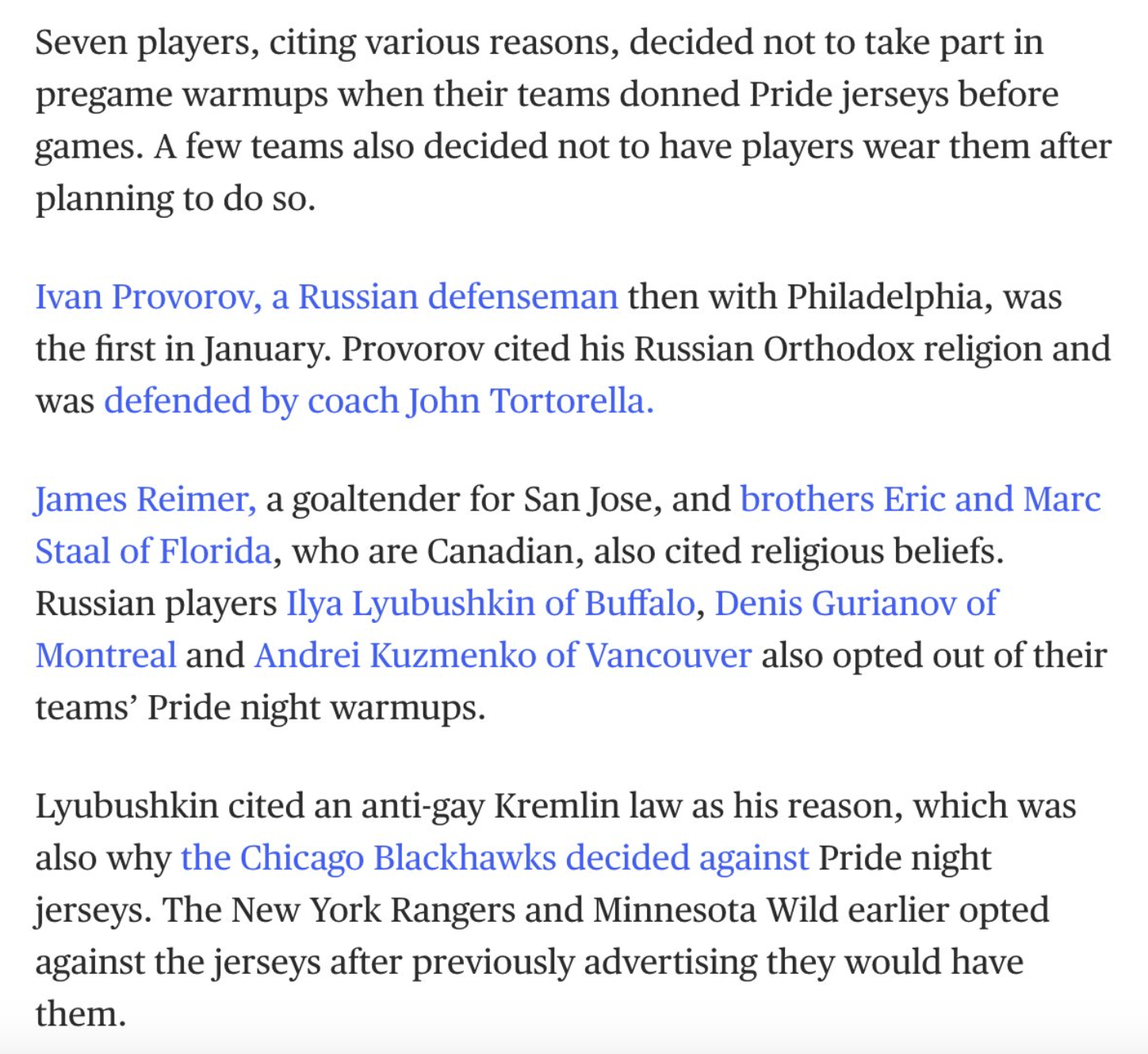 Ehkä SM-liigaankin pitäisi saada reilusti lisää pelaajia Venäjältä ja Unkarista. Silloin löytyisi useammalta liigakiekkoilijalta rohkeutta kieltäytyä sateenkaariväreistä. Eliteprospectsin mukaan SM-liigassa ei ole tällä kaudella pelannut yhtäkään venäläistä. Unkarilaisiakin löytyy tilastoista vain kolme: