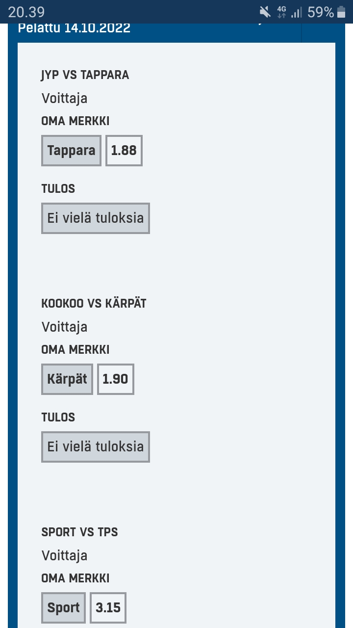 Niin itse näen tuon JYP - Tappara pelin vähän niin, että joko siellä on molemmilla pelattava kerroin tai sitten ei kummallakaan.Porukka ei ymmärrä että tuo varma voitto oli vaan heitto. Mä uskon, että Tappara voittaa ja kerroin 1.88 on erittäin pelattava. Tässä ei ole tunteilla mitään tekemistä vaan tarkkaa analyysiä joukkueista, voimasuhteista.