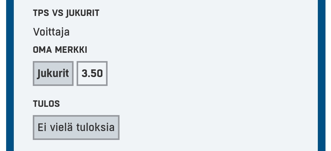 Äijä siellä haistellu tepesin jätkien ryyppyreissun ja sen seuraamukset.Pelasin tänään Jukurien voittoa ihan kivalla kertoimella. Nyt kun kokoonpanot on julkaistu Jukurien kerroin tippunut 2,88.