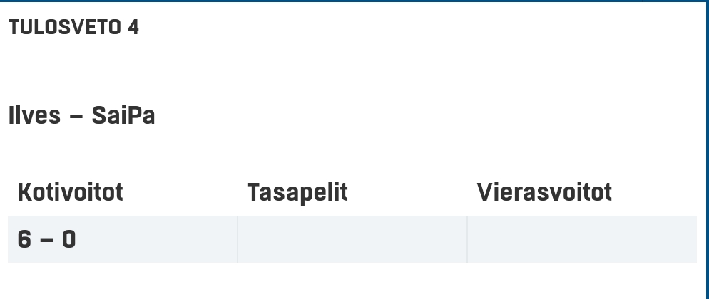 Joo Saipaa vastaan on hyvä kokeilla kertoimia, aika kovaa ovat ottaneet välillä tukkaan. Eli eiköhän Ilves pelaa virkamiesmäisen nihkeän pelin.Itse ajattelin koittaa maalintekijöiksi niitä jotka eivät "muutoin osuisi"