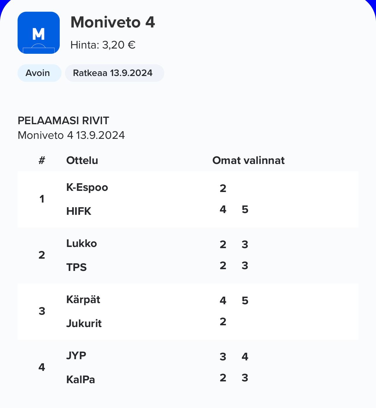 Kai tässä käy nyt se klassinen, että ensimmäisessä pelissä jalka poikki tai jotain muuta vastaavaa.Eemeli Suomi pistepörssin voitto 12 kertoimella (Unibet). 10€ kiinni.