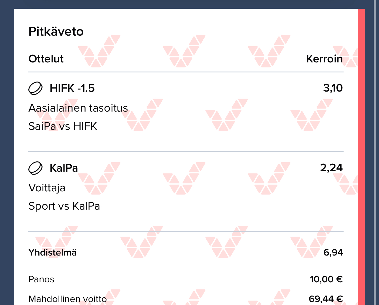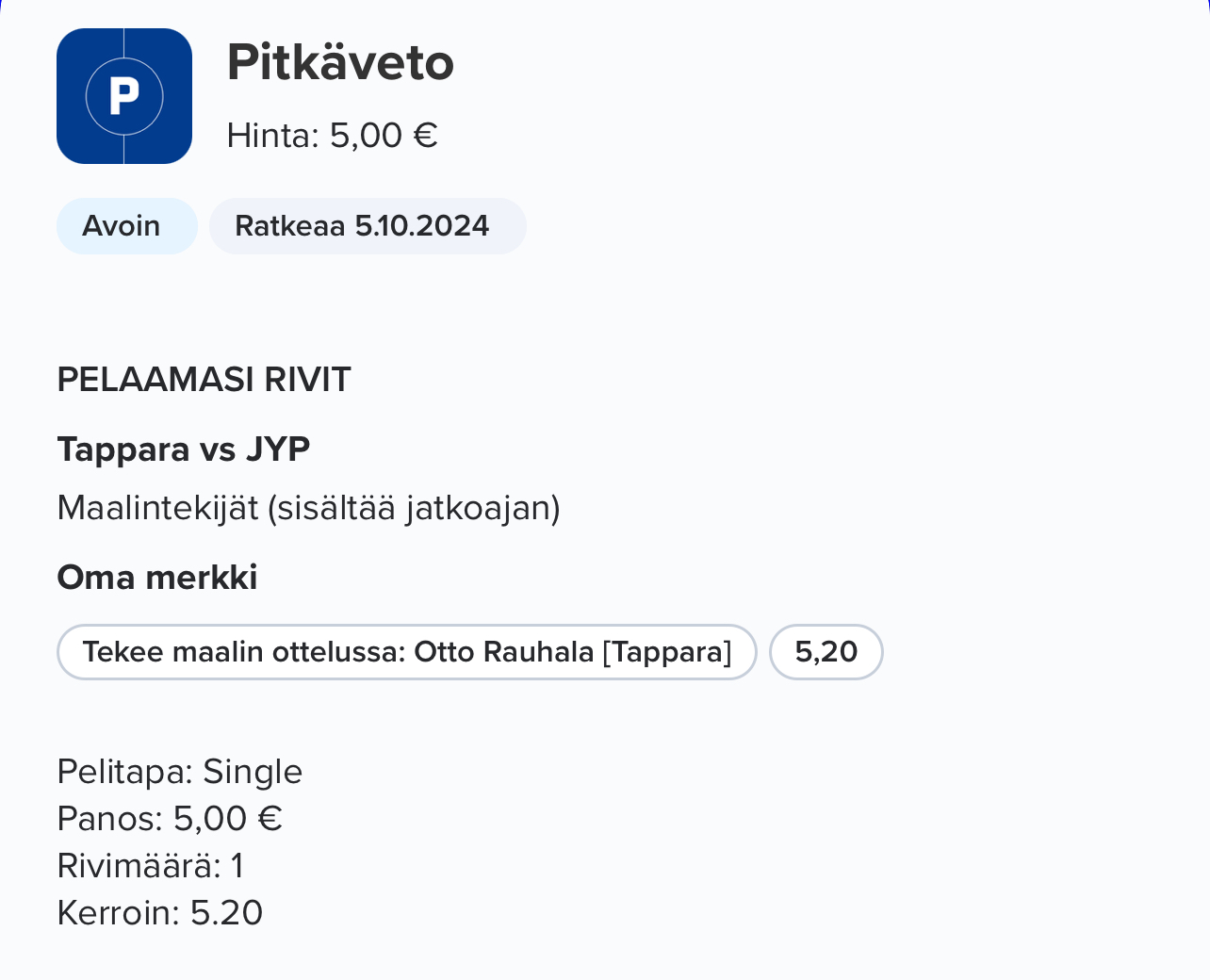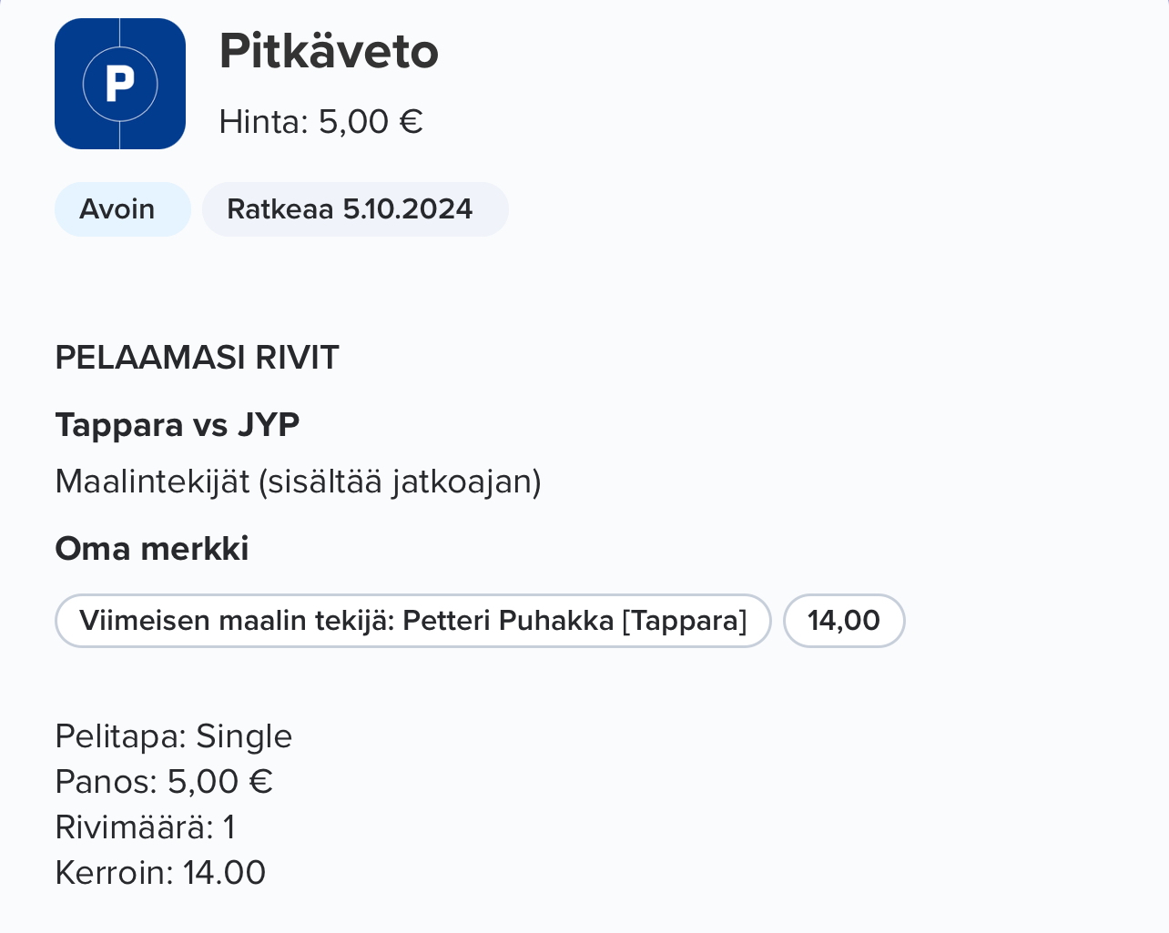 Ja laitetaan vielä vitonen viimeisen maalin tekijäksi kertoimella 20.00