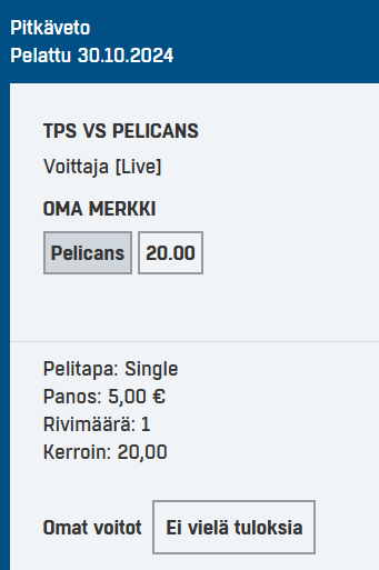 edit. No tuli sieltä silti 9800€ ja rapiat lohdutuspalkintoa alavoitoilla, mutta kyllä tämä vedonlyönti välillä korpeaa kunnolla.