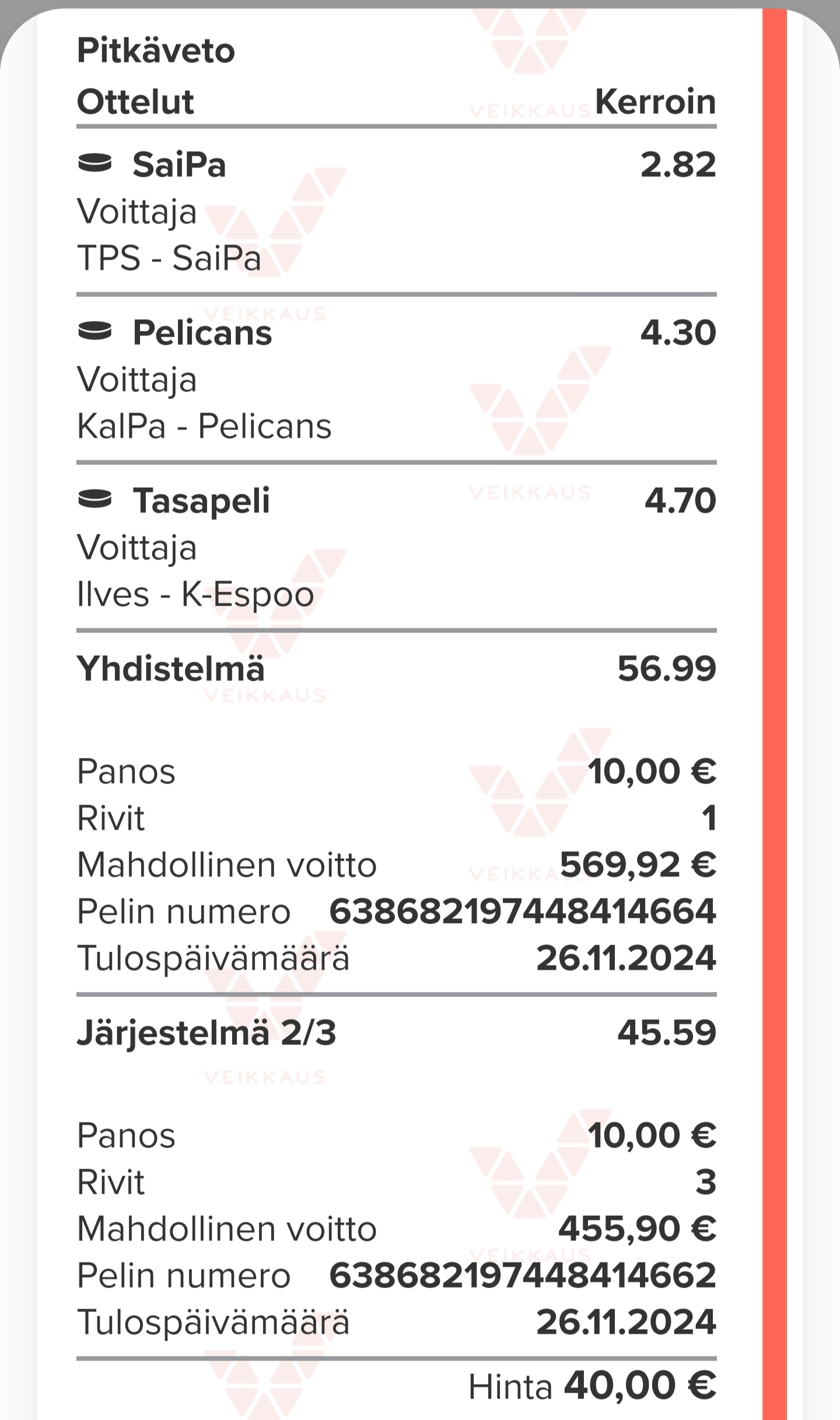 Laitoin eilen tuplan SaiPa ja Ilves. Nythän tuon pystyisi pelaamaan tukkoon ettei ainakaan tappiota tulisi... mutta menköön nyt tuolla ja luotetaan Ilvekseen.