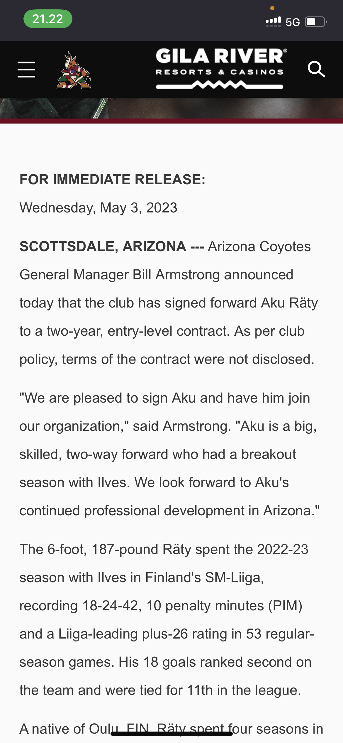 "Aku is a big, skilled, two-way forward who had a breakout season with Ilves. We look forward to Aku's continued professional development in Arizona."