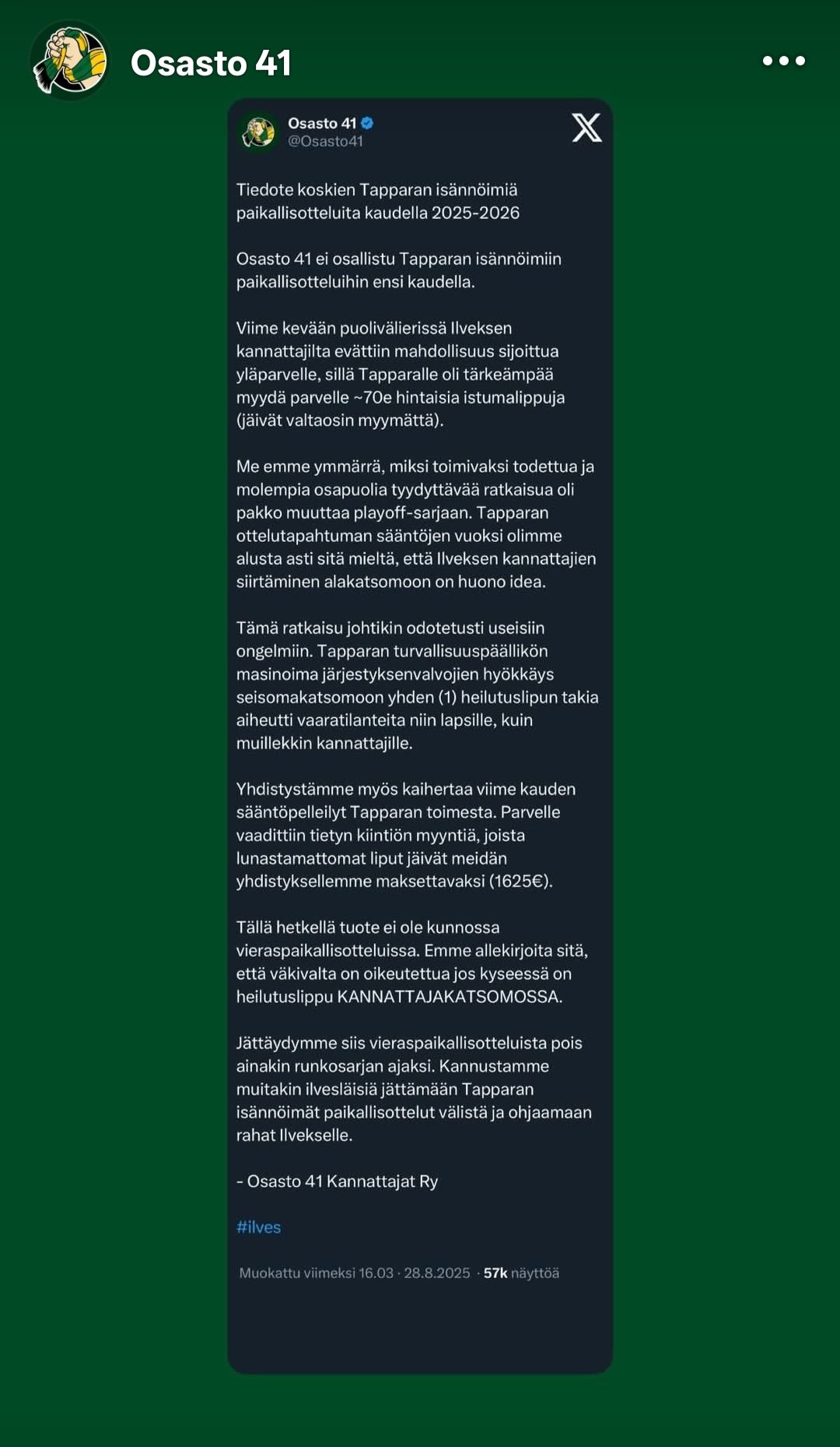 Onko kyse siis lippujen heiluttamisesta ja muusta kannattamisesta, jota ei taas saa tehdä, vai siitä, mitä järjestyksenvalvojat tekivät viimeksi? Nyt kun vieraskatsomo on tuolla ylhäällä, eikö siellä saisi kannattaa koko ottelun ajan? Vai onko kyse hinnoista, jotka ovat kyllä korkeat? Ehkä näiden yhdistelmä? Onko vielä jotain, mitä en nyt muista – ja mitkä ovat ne asiat, jotka Tapparan täytyy tehdä, jotta Osasto saataisiin takaisin näihin peleihin?