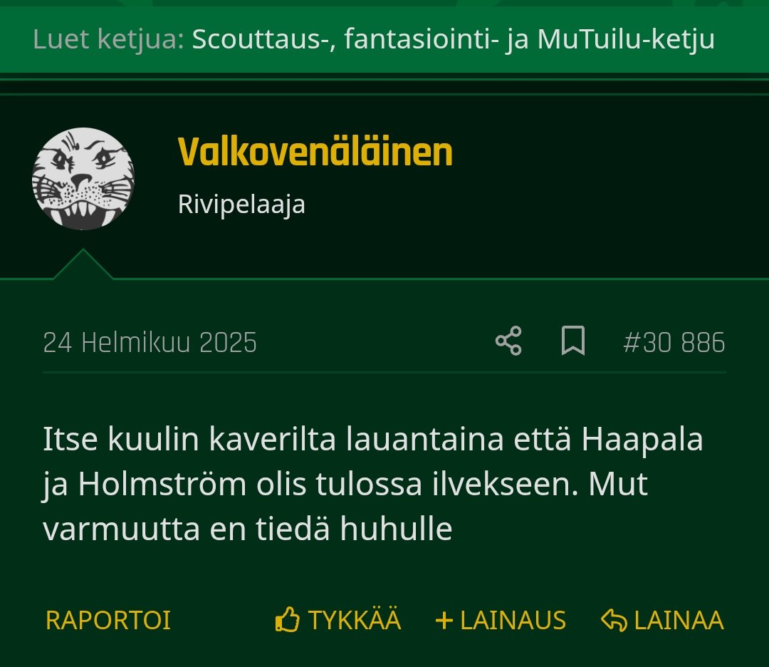 Kuuluu vissiin siihen porukkaan, joka saa noita kokoonpanoja ennakkoon esille, joku toinenkin komppasi naapurin forkalla tätä huhua.Jatkoajassa nimimerkki axe, joka on tunnetusti hyvinkin sisällä Tapparan sisäpiirissä sanoo kanssa, että Jasek ja Mäntykivi poissa. Ovatkohan kipeänä sitten? Jos ovat, niin tuskin huomennakaan pelaavat.