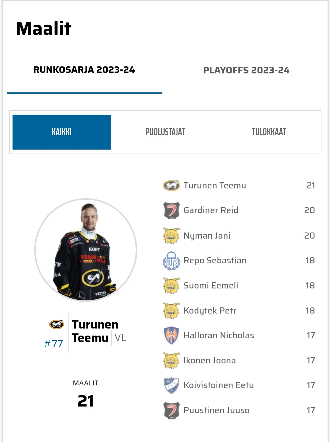 No se on 17,5 maalia/pelaaja.