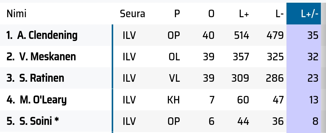 Juu toki nämä pitkän kauden aikana tasoittuu. Mutta esim. viime kaudella Latvala-Parikka keskiarvo oli noin 3 laukausta / peli pakkasta. Se nyt on ihan ymmärrettävääkin varsinkin Latvalan osalta. Enemmän huseeraa omissa.Viime kauden top 5