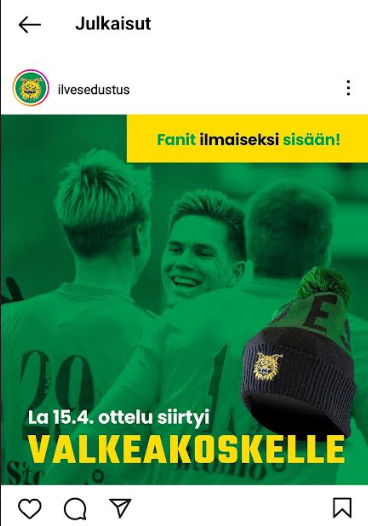 Tää futispuolen some on kyllä aivan ala-arvoista jääkiekkoon verrattuna. "Ottelu siirtyi" - pelattiinko se siis jo? Miksi "fanit" ja "sisään" pitää olla eri värillä? Typerän näköistä. Miksi tuo yksittäinen pipo ilman mitään muuta on pitänyt lyödä tuohon? Kuvaamaan sitä, että pipo päässä pääsee ilmaiseksi sisään? Joo ei ole tärkeimpiä juttuja - ennemmin peli kuntoon, mutta mieluusti tietenkin koko kokonaisuus.