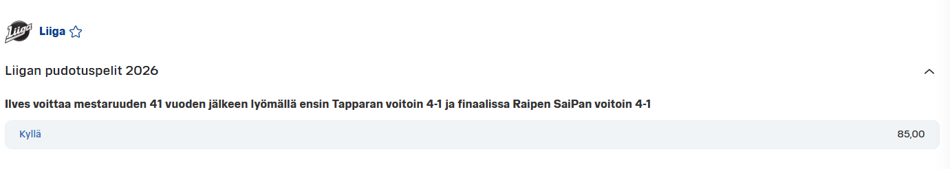 Todella vahvoina suosikkeina Veikkaus tosiaan pitää tamperelaisia näihin Kaakon joukkueisiin verrattuna. Oli finaalipari sitten mikä tahansa, niin siihen selvä suosikki tulee Tampereen sarjasta, jos ei nyt jotain ihan dramaattisia loukkaantumisia tjms. tule.