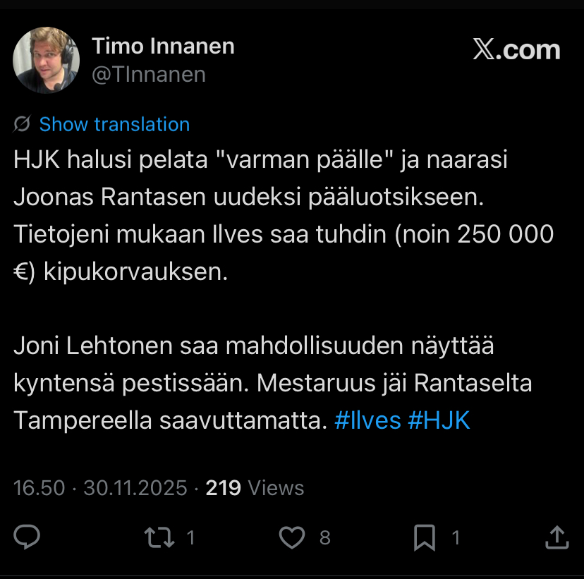 250 tonnia on aikalailla siedettävä, mutta täytyy huomioida että Ilves riskeeraa tässä ensi kauden sijoitusnäkymiä, ja täten vuoden 2027 europelejä. Niistä käteen ehkä jäisi kulujen jälkeen 250 tonnia, ehkä enemmän. Tuossa mielessä summa vain paikkaa mahdollisia tappioita. Toki jos Lehtosen alaisuudessa asiat eivät muutu ja ollaan europeleillä, sitten ollaan voiton puolella sillä ilmeisesti Rantanen olisi lähtenyt muutenkin ensi kauden jälkeen.Yx Rantanen ei vielä Klubia takaisin mestariksi nosta. Epäonnistui Ilveksessä tällä kaudella, joten menköön sitten, kun näköjään haluaa rahan perässä juosta.