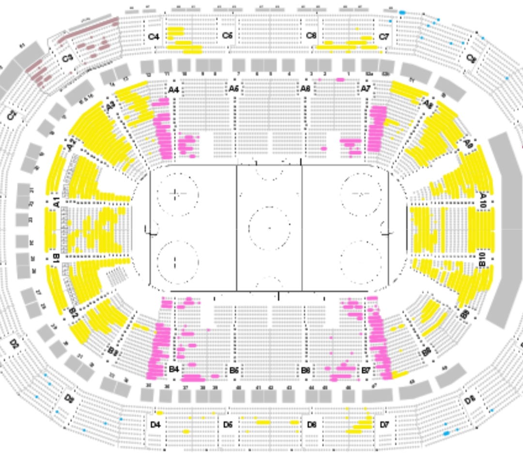 Keltaisille paikoille 265€ ja pinkeille 295€ Katsomokartta näyttää tältä.