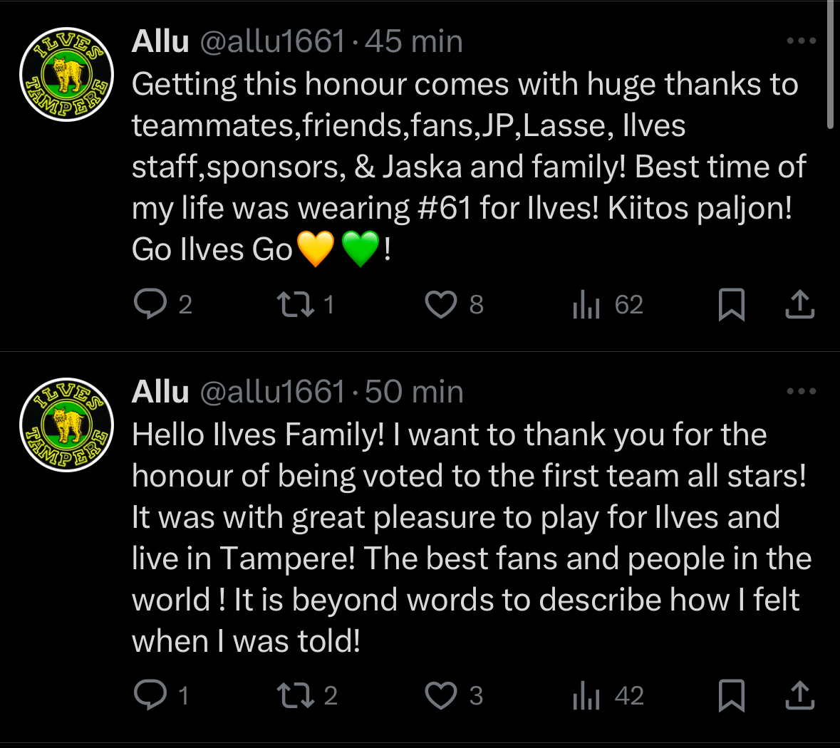 No mun papereissa all-stars kentällinen on sellainen parhaista pelaajista koostettu viisikko. Sellaiseen ei, kaikella kunnioituksella, Jarkko Parikka kuulu. Pelasihan Measureskin enemmän pelejä Lukossa kuin Ilveksessä. Murphyn aika Ilveksessä oli toki lyhyt, mutta omasta ikäluokastani on kyllä monelle ihan ensimmäisiä oikeasti sykähdyttäneitä pelaajia. Näistä syistä päätyi omalle äänestyskupongillenikin.Pakko sanoa, että olen ehkä vähän pettynyt, että Parikka ei löytynyt kummastakaan joukkueesta.