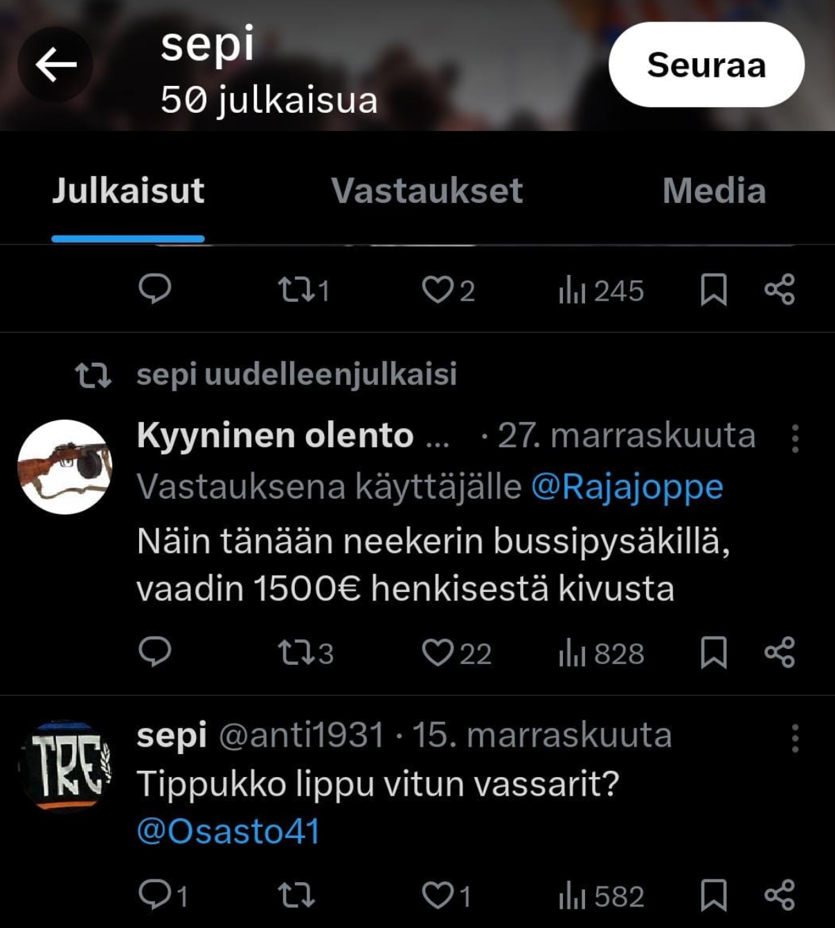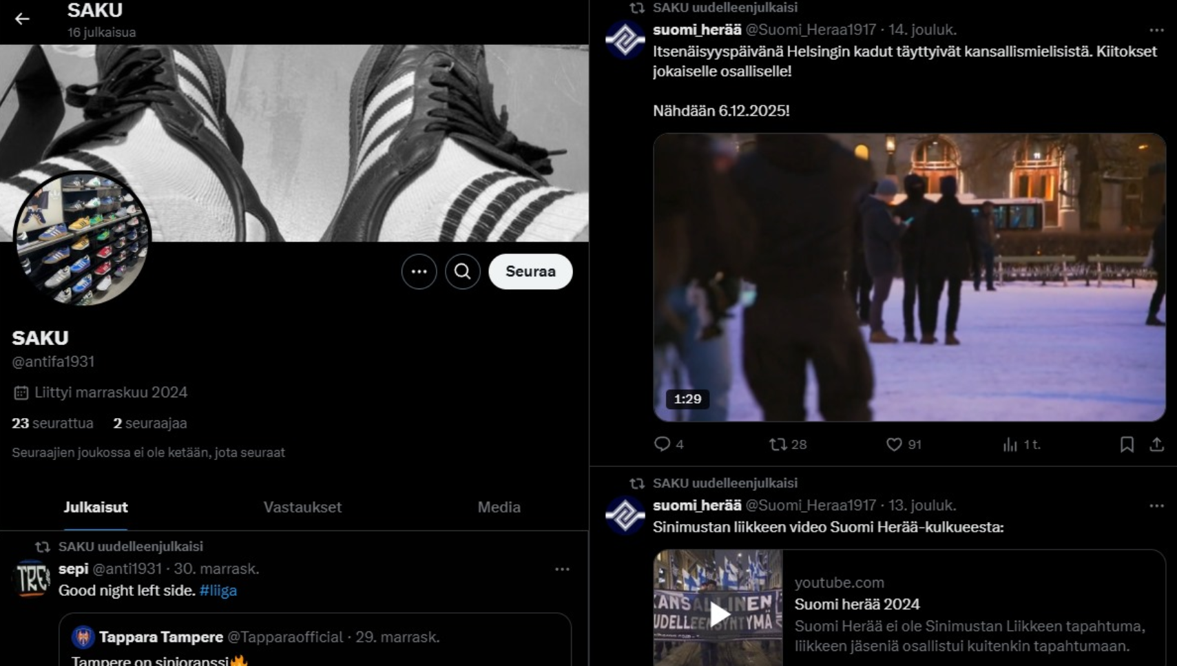On kyllä söpö larppi päällä pojillaTuli tässä Twitteriä selaillessani vastaan tällaisia naapuriseuraan Tre Crew'n ilmeisiä jäseniä. Käyttäjien sivut siis täynnä äärioikeistopropagandaa ja Tapparan kannatustoimintaan liittyviä postauksia täysin avoimesti ja Tre Crew'ta edustaen. Käyttäjät myös avoimesti tukevat fasistista ja rasistista Sinimustaa liikettä, kuten liitteenä olevista näyttökuvista näkyy.