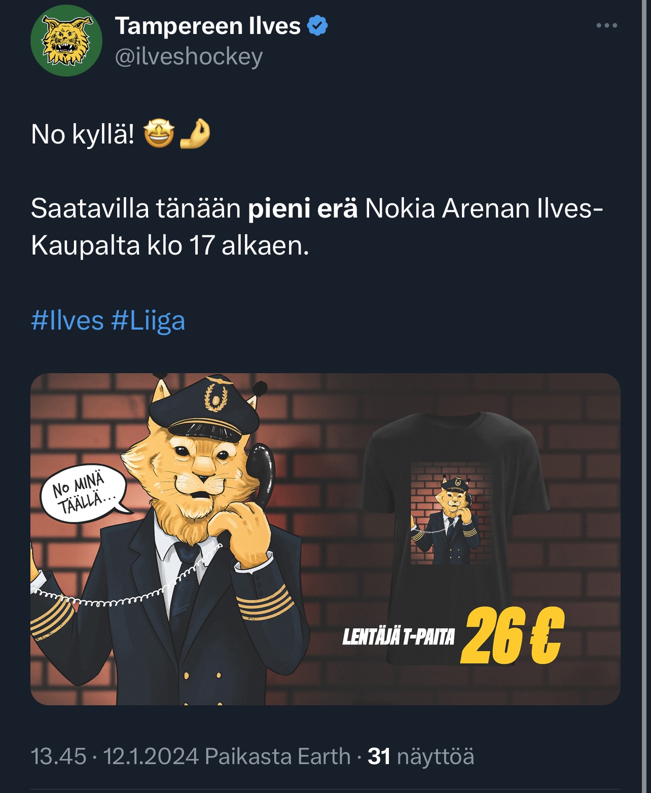 Pitäs varmaa vinkata ilves kaupalle en tiedä mikä siihen on syy? Onko uusi areena ku muutenkin lipuista väännetty mutta kyllä niitä tarvittas