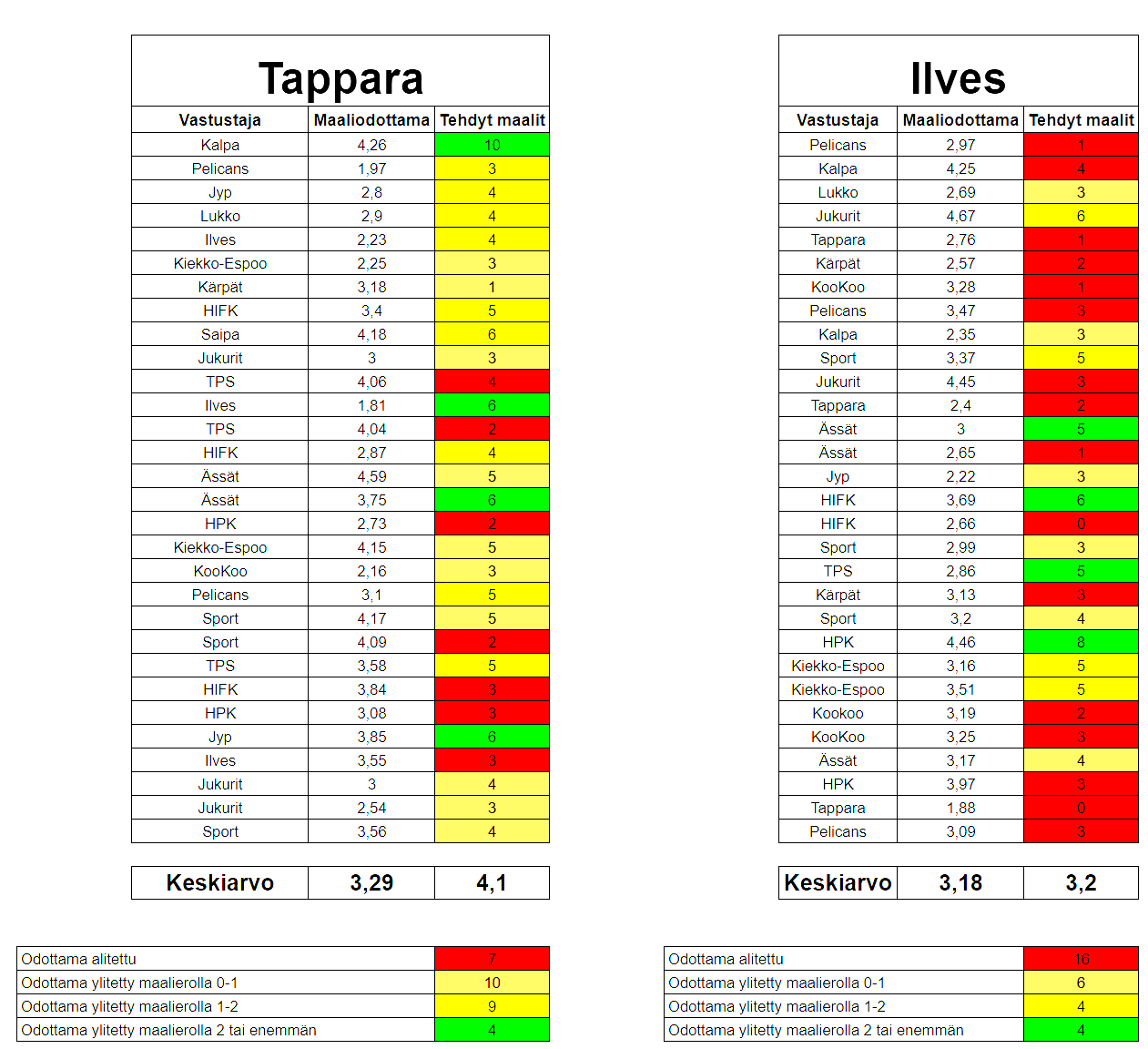 30 viimeisintä Liiga-ottelua molemmilta joukkueilta, jotta kyse ei ole yksittäisistä peleistä tai hetkellisestä formista, vaan siitä, miten nämä joukkueet oikeasti suorittavat pidemmällä aikavälillä. Tämän taulukon tarkoitus on siis suoraan verrata maaliodottamaa suhteessa tehtyihin maaleihin.