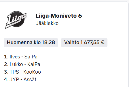 Nauraen pankkiin! *tähän se Raipe nauramassa kuva.Jaaha, on se helppoa, kun kahteen peliin tietää voittajan ja niiden pelien maalieron suhteen. Siitä on helppo rakentaa pyydykset