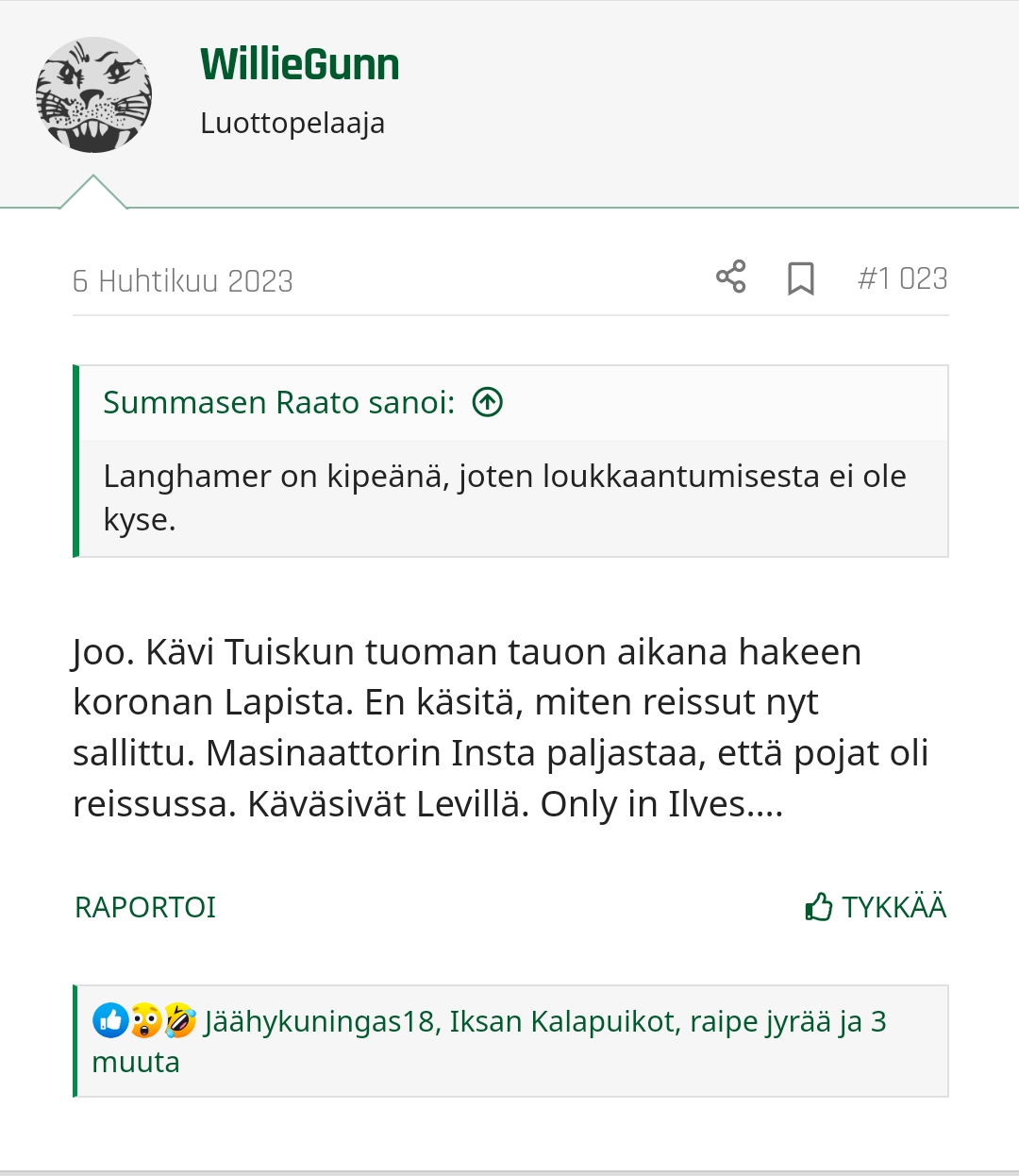 Siis ennen pronssipeliä siellä käytiin, mutta sillä ei ole mun mielestä mitään väliä.Joo itseäni tuo Levi homma vähän ihmetyttikin että kävikö siellä oikeasti joku vai miksi se edelleen on puheissa