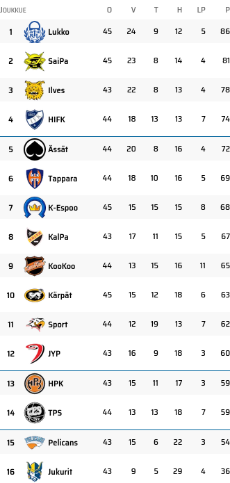 Tällä hetkellä näyttää siltä että kolmen kärki olisi irrottautumassa. Sitten olisi kisa paikasta neljä jolla saisi sen viimeisen suoran puolivälieräpaikan sekä kotiedun sinne. SaiPan olo tuossa kolmen kärjessä on se suurin yllätys, kyllä Raipe on vain äärimmäisen kovaa työtä tehnyt. Tuossa näkee valmentajan arvon.