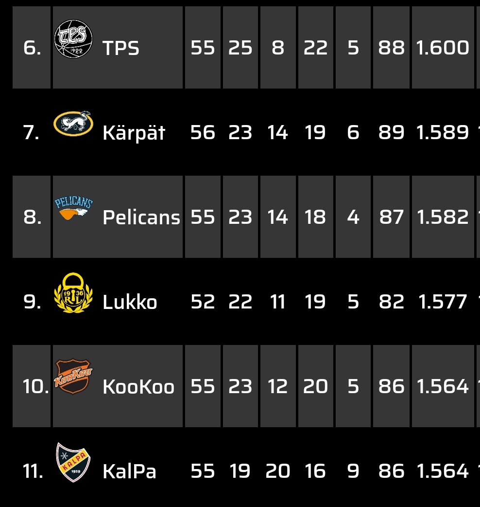 Tällä hetkellä:Onko tilanne nyt siis se, että ollaan siirrytty P/O keskiarvoon koska Lukko on ainoa joukkue joka ei saa kaikkia pelejä?