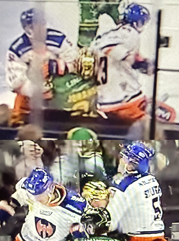 Ei se nyt suora osuma linjatuomariin ole kun vastustajan häntä päin taklaat mutta eipä tuolla mitään tekemistä jääkiekon kanssa enää ole kun peli ei ole käynnissä ja tuossa kuitenkin sauma käydä pahemmin linjatuomarille jolla varustus on aika vähäistä.