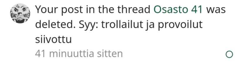 En muista mitä just sää olit sinne vastaillut, mutta katselin just kyseistä ketjua ja sieltä oli sen yhden mouhotrollin viestit poistettu. Yleensä ylläpito tykkää poistaa sekä noi provoviestit että niiden saamat vastaukset. Toki en tästä aivan 100% varma ole, ylläpito saa itse joko tukea mun huomiotani tai kumota sen.katso liitettä 8506