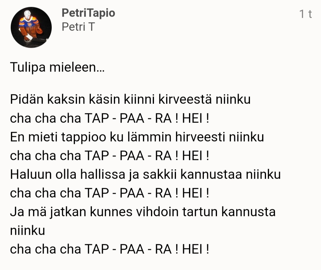 Tää aiheutti kyllä hyvällä tapaa ääneen naurahduksen. Tohon kun sais "käärijätanssin" vielä lisäksi ja koko hallin päädyn vetään samaa: