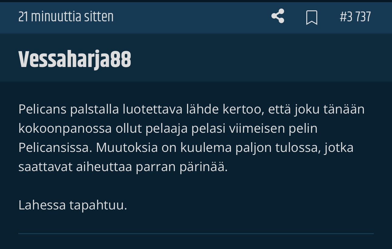 Ei pysty enää lainaamaan viestejä otteluseurannasta, mutta vastataan nyt tähän ja samalla @rakitic ille. En valitettavasti usko, että Väisäsestä päästään eroon. Sieltä pitäisi löytyä jengi jonka Rangers kokee hyödylliseksi. En usko esimerkiksi täysin sekaisin olevaa Pelicansia sellaisena, ne jengit joille Rangers näyttäisi vihreää valoa tuskin Väisästä ottaa.