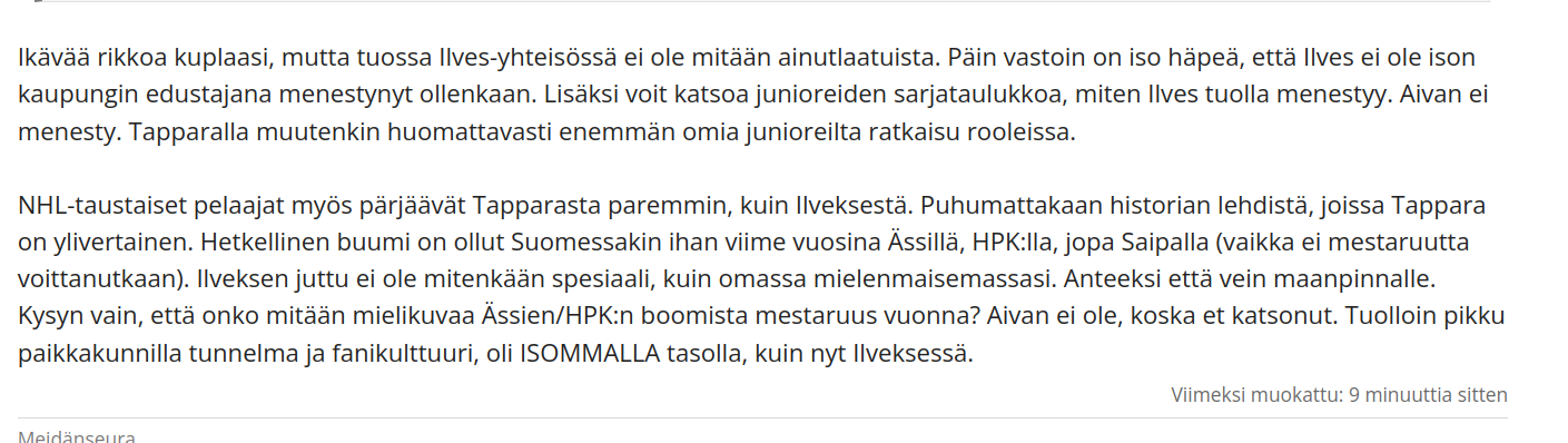 Siellä on paljon hyviä kirjoituksia ja asiallista keskustelua. mutta osalla kirjoittajista huomaa hyvin sen, että moni pelkää Ilveksen pitkästä aikaa tuloksellisestikin ohittavan Tapparan. Tämä pelko onkin varmaan yksi suuri syy runsaaseen Ilves-kirjoitteluun.