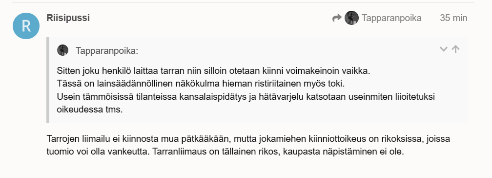 On toi naapurin sakki kyllä harhaista. Siellä tosiaan jo kansalaispidätystä heitellään ilmoille ja ollaan muutenkin saatanan tekopyhiä.